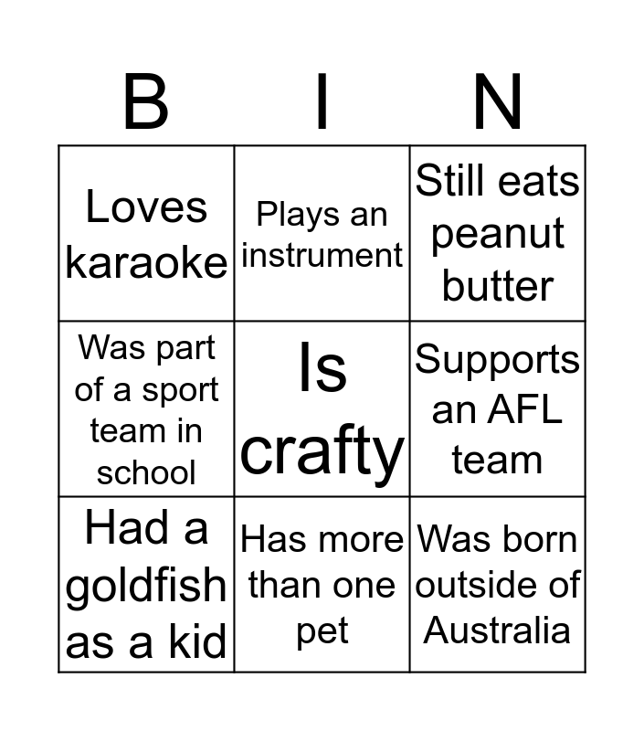 This bingo card has 9 words: Had a goldfish as a kid, Still eats peanut butter, Plays an instrument, Was part of a sport team in school, Loves karaoke, Supports an AFL team, Is crafty, Was born outside of Australia and Has more than one pet.