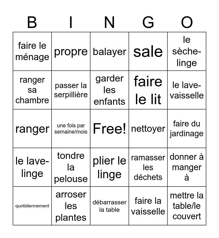 This bingo card has a free space and 29 words: quotidiennement, tous les jours, une fois par semaine/mois, laver, faire le ménage, balayer, passer la serpillière, tondre la pelouse, nettoyer, arroser les plantes, faire du jardinage, mettre la table/le couvert, débarrasser la table, faire la vaisselle, le lave-vaisselle, laver/faire le linge, plier le linge, le lave-linge, le sèche-linge, ranger, ramasser les déchets, passer l'aspirateur, faire le lit, ranger sa chambre, sale, propre, donner à manger à, garder les enfants and donner un coup de main.