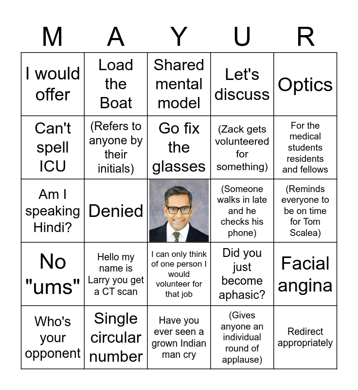 This bingo card has a free space and 24 words: Hello my name is Larry you get a CT scan, Single circular number, Go fix the glasses, Who's your opponent, Optics, I would offer, Can't spell ICU, Load the Boat, (Someone walks in late and he checks his phone), I can only think of one person I would volunteer for that job, (Zack gets volunteered for something), Am I speaking Hindi?, Did you just become aphasic?, Facial angina, (Refers to anyone by their initials), (Gives anyone an individual round of applause), (Reminds everyone to be on time for Tom Scalea), Shared mental model, For the medical students residents and fellows, Denied, Redirect appropriately, No "ums", Let's discuss and Have you ever seen a grown Indian man cry.