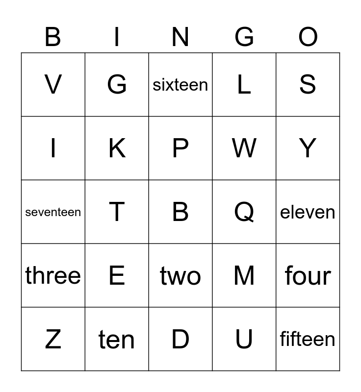 This bingo card has 46 words: A, B, C, D, E, F, G, H, I, J, K, L, four, M, N, O, P, Q, R, S, T, U, V, W, X, Y, Z, one, two, three, five, six, seven, eight, nine, ten, eleven, twelve, thirteen, fourteen, fifteen, sixteen, seventeen, eighteen, nineteen and twenty.