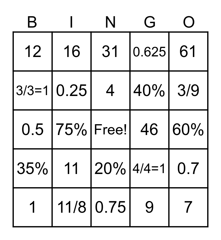 This bingo card has a free space and 24 words: 1, 11, 4, 9, 61, 12, 16, 31, 46, 60%, 0.5, 0.25, 4/4=1, 0.7, 3/3=1, 11/8, 0.75, 0.625, 3/9, 35%, 75%, 20%, 40% and 7.