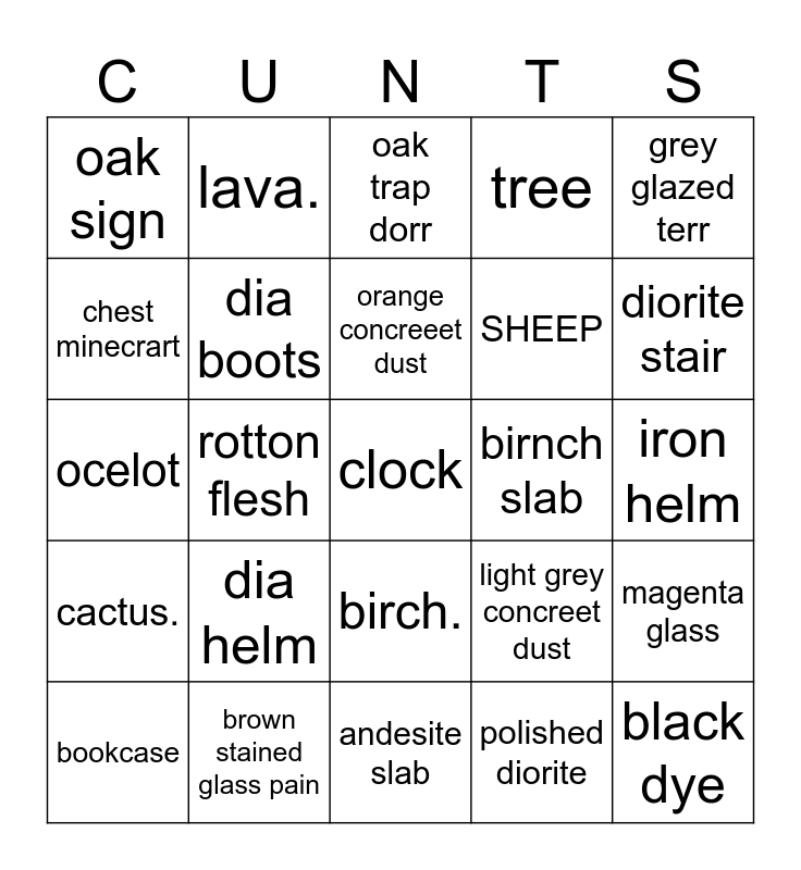 This bingo card has a free space and 24 words: dia helm, brown stained glass pain, orange concreeet dust, bookcase, grey glazed terr, oak sign, chest minecrart, lava., birnch slab, birch., SHEEP, ocelot, light grey concreet dust, magenta glass, dia boots, polished diorite, iron helm, oak trap dorr, diorite stair, rotton flesh, black dye, cactus., tree and andesite slab.