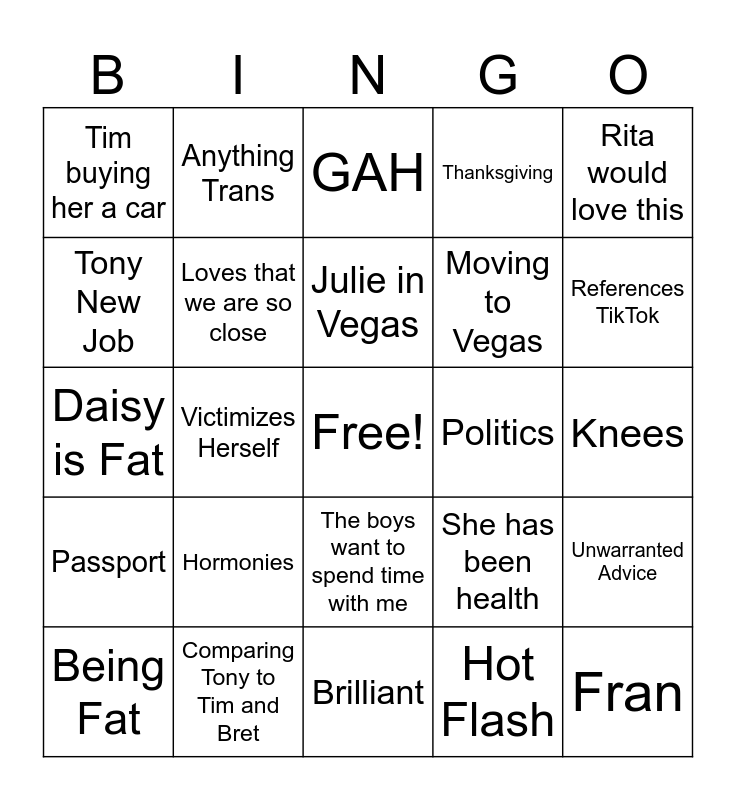 This bingo card has a free space and 24 words: Hormonies, Comparing Tony to Tim and Bret, Julie in Vegas, Being Fat, Rita would love this, Tim buying her a car, Tony New Job, Anything Trans, Politics, The boys want to spend time with me, Moving to Vegas, Daisy is Fat, She has been health, Unwarranted Advice, Loves that we are so close, Hot Flash, Knees, GAH, References TikTok, Victimizes Herself, Fran, Passport, Thanksgiving and Brilliant.