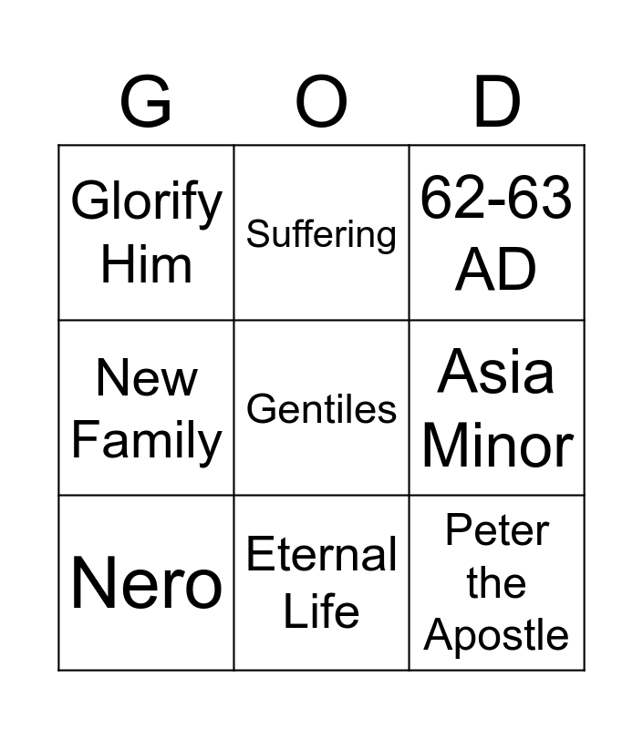 This bingo card has 12 words: Rome, Peter the Apostle, Gentiles, Asia Minor, Suffering, 62-63 AD, Eternal Life, Strength, Glorify Him, New Family, Nero and God's chosen people.