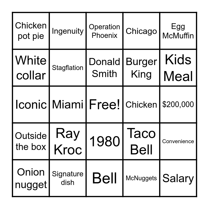 This bingo card has a free space and 38 words: Corporate warfare, Innovation, Vietnam war, Stagflation, Convenience, Ray Kroc, Donald Smith, Franchise, Egg McMuffin, Burger King, Miami, Chicago, Salary, $200,000, White collar, Outside the box, Big Mama, Operation Phoenix, Red meat, Chicken, Chicken pot pie, Signature dish, Kids Meal, Onion nugget, SWAT team, Bell, Ball, Boot, Bow tie, Chicken paste, Dippable, 1980, McNuggets, Ingenuity, Pizza Hut, Taco Bell, Iconic and Annual sales.