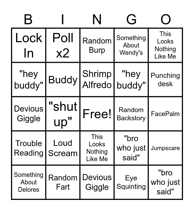 ⚠ This card has duplicate items: Something About Delores (2), "do me a solid" (2), Lock In (2), Standing/Leaving Frame (2), "shut up" (2), Trouble Reading (2), "yo W's in the chat for ___" (2), "bro who just said" (2), Loud Scream (2), "AYOOO" (2), 3 Second Stutter (2), Buddy (2), FacePalm (2), _/10 (2), Poll x2 (2), Devious Giggle (2), "hey buddy" (2), Headset Off (2), Random Backstory (2), Shrimp Alfredo (2), Something About Wendy's (2), This Looks Nothing Like Me (2), "goodness" (2)