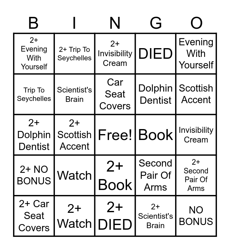 This bingo card has a free space and 24 words: Watch, 2+ Watch, Car Seat Covers, 2+ Car Seat Covers, Evening With Yourself, 2+ Evening With Yourself, Trip To Seychelles, 2+ Trip To Seychelles, Book, 2+ Book, Dolphin Dentist, 2+ Dolphin Dentist, Second Pair Of Arms, 2+ Second Pair Of Arms, Scientist's Brain, 2+ Scientist's Brain, Invisibility Cream, 2+ Invisibility Cream, Scottish Accent, 2+ Scottish Accent, NO BONUS, 2+ NO BONUS, DIED and 2+ DIED.