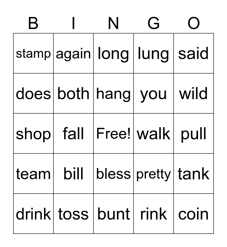 This bingo card has a free space and 24 words: bill, toss, hang, drink, said, stamp, does, again, walk, bless, you, shop, pretty, tank, both, rink, pull, long, wild, fall, coin, team, lung and bunt.