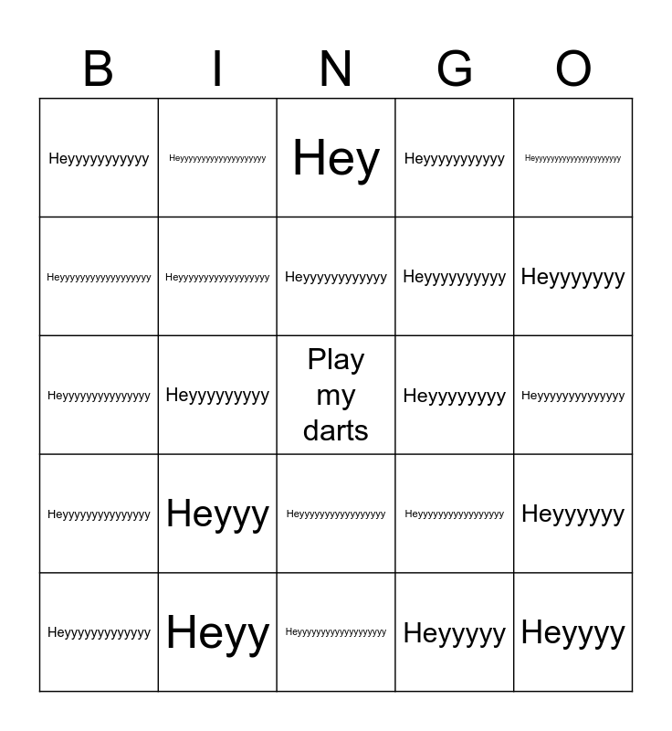 This bingo card has a free space and 24 words: Heyyy, Heyy, Heyyyyyyyyyyyy, Heyyyyyyyyyyyyy, Heyyyyyyyyyyyyyyyyyyyyyy, Heyyyyyyyyyyy, Heyyyyyyyyyyyyyyyyyy, Heyyyyyyyyyyyyyyyyyyyy, Heyyyyyyyy, Heyyyyyyyyyyyyyyyyy, Heyyyyyyyyyy, Heyyyyyyyyyyyyyyy, Heyyyyyyyyyyyyyyyyy, Heyyyyyy, Heyyyyyyyyyyyyyyyyyy, Heyyyyy, Heyyyyyyyyyyyyyy, Hey, Heyyyyyyy, Heyyyyyyyyy, Heyyyy, Heyyyyyyyyyyyyyyy, Heyyyyyyyyyyy and Heyyyyyyyyyyyyyyyyyyy.