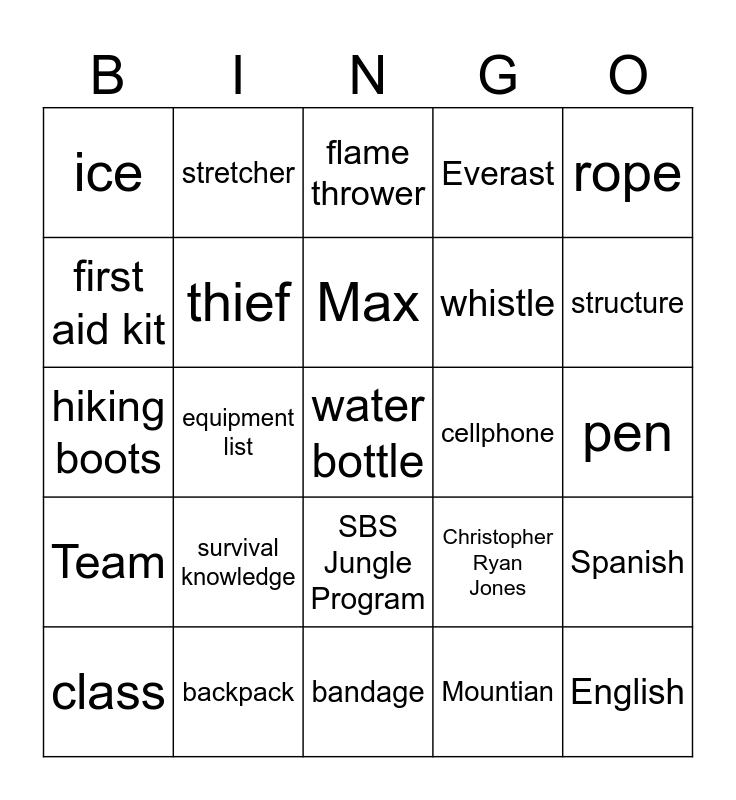 This bingo card has 34 words: English, Mountian, Charles, Rescue, Team, thief, rope, class, stretcher, helicopter, Max, flame thrower, GPS, notebook, cellphone, structure, backpack, hiking boots, survival knowledge, Christopher Ryan Jones, SBS Jungle Program, laptop, ice, pen, bandage, water bottle, Everast, flashlight, whistle, first aid kit, flare gun, equipment list, Spanish and bedwars.
