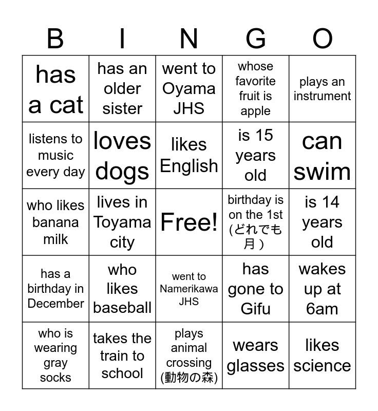 This bingo card has a free space and 24 words: who likes baseball, takes the train to school, likes English, who is wearing gray socks, plays an instrument, has a cat, listens to music every day, has an older sister, birthday is on the 1st (どれでも月), went to Namerikawa JHS, is 15 years old, who likes banana milk, has gone to Gifu, wakes up at 6am, loves dogs, wears glasses, is 14 years old, went to Oyama JHS, can swim, lives in Toyama city, likes science, has a birthday in December, whose favorite fruit is apple and plays animal crossing (動物の森).
