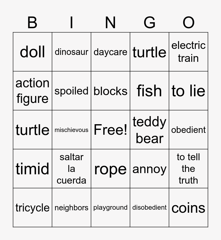 This bingo card has a free space and 24 words: saltar la cuerda, neighbors, blocks, tricycle, electric train, doll, action figure, dinosaur, teddy bear, rope, fish, turtle, annoy, to tell the truth, spoiled, disobedient, obedient, daycare, to lie, mischievous, coins, timid, turtle and playground.