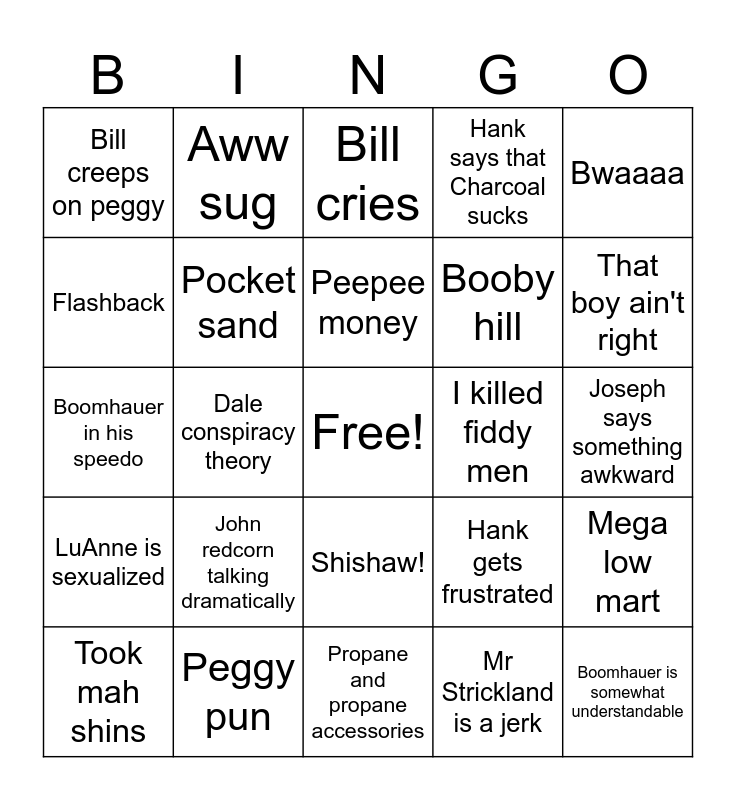 This bingo card has a free space and 26 words: Shishaw!, Mr Strickland is a jerk, Peepee money, Peggy pun, Bwaaaa, Bill creeps on peggy, Flashback, Aww sug, Joseph says something awkward, Hank gets frustrated, Booby hill, Boomhauer in his speedo, Mega low mart, Took mah shins, Dale conspiracy theory, Laaady bird!, Hank says that Charcoal sucks, LuAnne is sexualized, Bill cries, Boomhauer is somewhat understandable, That boy ain't right, Propane and propane accessories, I killed fiddy men, John redcorn talking dramatically, Pocket sand and Hoo yeah!.