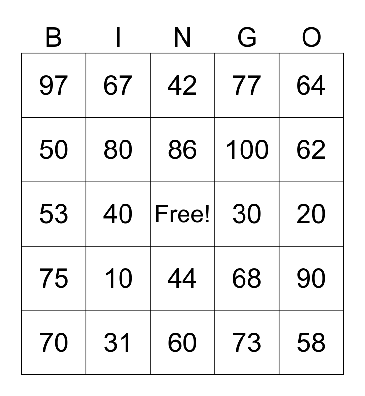 This bingo card has a free space and 24 words: 10, 31, 86, 70, 64, 97, 50, 67, 30, 44, 100, 53, 68, 90, 80, 73, 20, 42, 62, 40, 58, 75, 77 and 60.