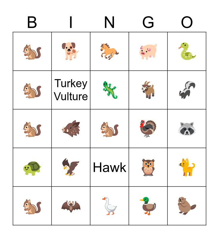 This bingo card has a free space and 29 words: đŋī¸, đ, đ, đ, đŋī¸, đ, Turkey Vulture, đĻ , đĻ, đĻ, đĻ, đĻĢ, đĒŋ, đĻ, đύ, đ, Hawk, đĸ, đ, đŋī¸, đĻ, đ, đ, đŋī¸, đ, đ, đ, đĻ and đĻ.
