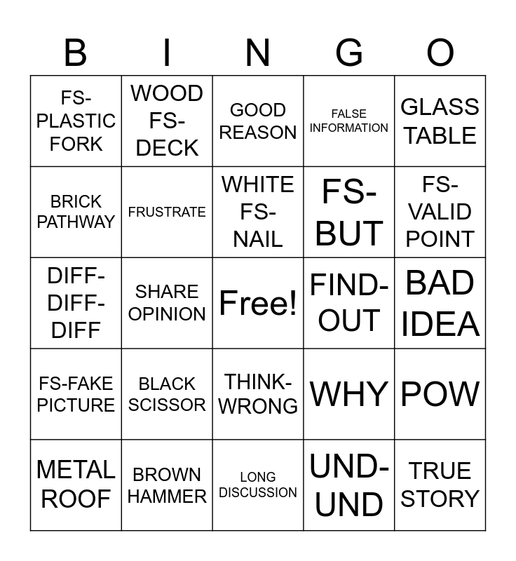 This bingo card has a free space and 24 words: BLACK SCISSOR, BROWN HAMMER, WHITE FS-NAIL, METAL ROOF, GLASS TABLE, FS-PLASTIC FORK, BRICK PATHWAY, WOOD FS-DECK, FIND-OUT, THINK-WRONG, FS-BUT, DIFF-DIFF-DIFF, WHY, POW, FRUSTRATE, UND-UND, BAD IDEA, GOOD REASON, FS-VALID POINT, SHARE OPINION, TRUE STORY, FS-FAKE PICTURE, FALSE INFORMATION and LONG DISCUSSION.