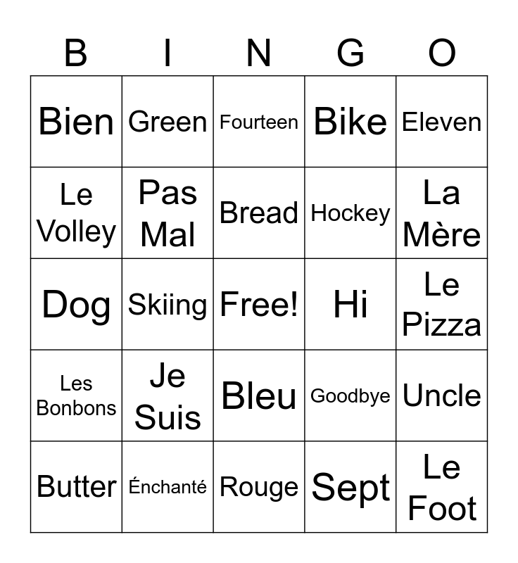 This bingo card has a free space and 34 words: Milk, Sept, La Gym, Le Poulet, Les Bonbons, Pas Mal, Eleven, Butter, Green, Basketball, Bread, Fourteen, Rose, Brother, Hi, La Mère, Énchanté, Dog, Je Suis, Goodbye, Bleu, Douze, Bien, Le Pizza, Rouge, Le Foot, Bike, Ball, Hockey, Le Volley, Dix, Skiing, Uncle and Violet.