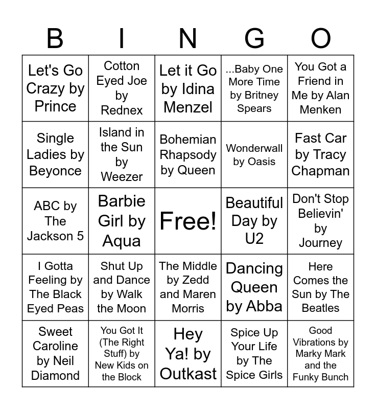 This bingo card has a free space and 29 words: Sweet Caroline by Neil Diamond, It's Gonna Be Me by *NSYNC, Barbie Girl by Aqua, MMMBop by Hanson, Let's Go Crazy by Prince, Let it Go by Idina Menzel, Island in the Sun by Weezer, Shut Up and Dance by Walk the Moon, Beautiful Day by U2, You Got It (The Right Stuff) by New Kids on the Block, Don't Stop Believin' by Journey, Good Vibrations by Marky Mark and the Funky Bunch, Hey Ya! by Outkast, Spice Up Your Life by The Spice Girls, Fast Car by Tracy Chapman, Walking on Sunshine by Katrina and the Waves, The Middle by Zedd and Maren Morris, I Gotta Feeling by The Black Eyed Peas, You Got a Friend in Me by Alan Menken, ABC by The Jackson 5, Dancing Queen by Abba, I Will Always Love you by Whitney Houston, Wonderwall by Oasis, Single Ladies by Beyonce, ...Baby One More Time by Britney Spears, Cotton Eyed Joe by Rednex, Here Comes the Sun by The Beatles, Bohemian Rhapsody by Queen and Wind Beneath My Wings by Bette Midler.