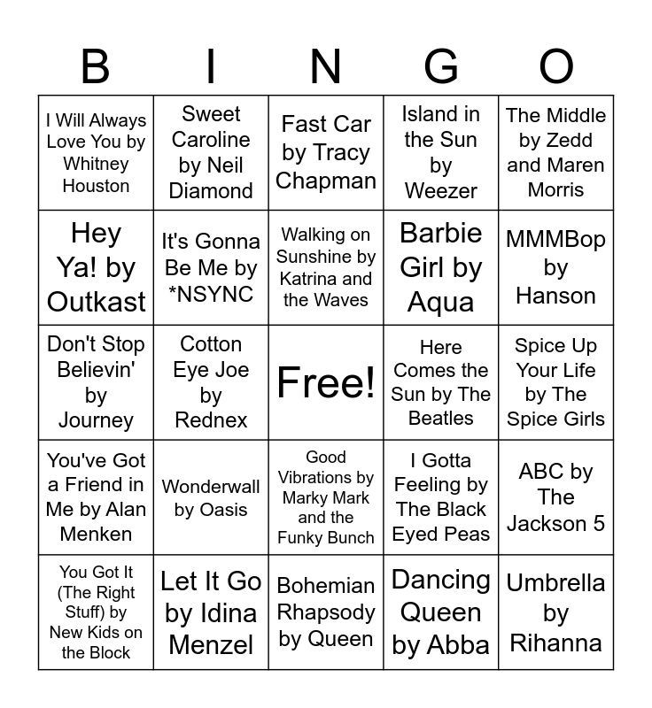 This bingo card has a free space and 29 words: You Got It (The Right Stuff) by New Kids on the Block, Shut Up and Dance by Walk the Moon, Cotton Eye Joe by Rednex, Wind Beneath My Wings by Bette Midler, I Will Always Love You by Whitney Houston, Fast Car by Tracy Chapman, It's Gonna Be Me by *NSYNC, Wonderwall by Oasis, Here Comes the Sun by The Beatles, Let It Go by Idina Menzel, Spice Up Your Life by The Spice Girls, Umbrella by Rihanna, Bohemian Rhapsody by Queen, Dancing Queen by Abba, MMMBop by Hanson, Single Ladies by Beyonce, Good Vibrations by Marky Mark and the Funky Bunch, You've Got a Friend in Me by Alan Menken, The Middle by Zedd and Maren Morris, Don't Stop Believin' by Journey, I Gotta Feeling by The Black Eyed Peas, ...Baby One More Time by Britney Spears, Barbie Girl by Aqua, Hey Ya! by Outkast, Island in the Sun by Weezer, Sweet Caroline by Neil Diamond, ABC by The Jackson 5, Walking on Sunshine by Katrina and the Waves and Beautiful Day by U2.