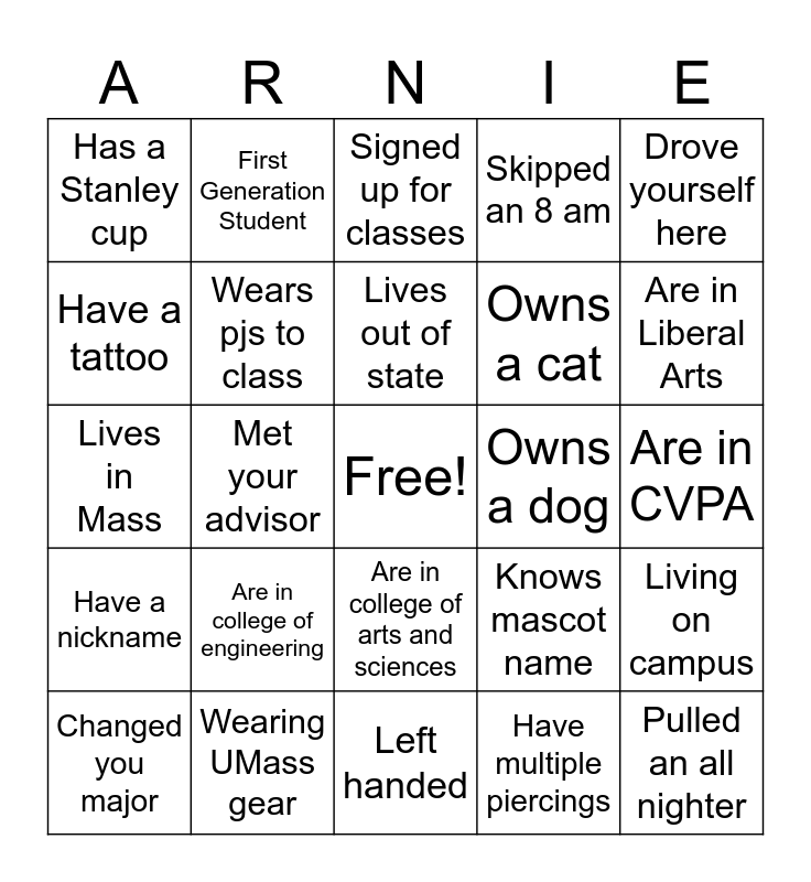 This bingo card has a free space and 27 words: Knows mascot name, Are in CCB, Owns a cat, Left handed, Have a tattoo, Signed up for classes, First Generation Student, Have a nickname, Owns a dog, Living on campus, Lives in Mass, Skipped an 8 am, Changed you major, Wearing UMass gear, Are in Liberal Arts, Knows the road name of the university, Wears pjs to class, Lives out of state, Are in college of engineering, Has a Stanley cup, Are in CVPA, Have multiple piercings, Met your advisor, Pulled an all nighter, Are in college of arts and sciences, Drove yourself here and Lives in Dartmouth.