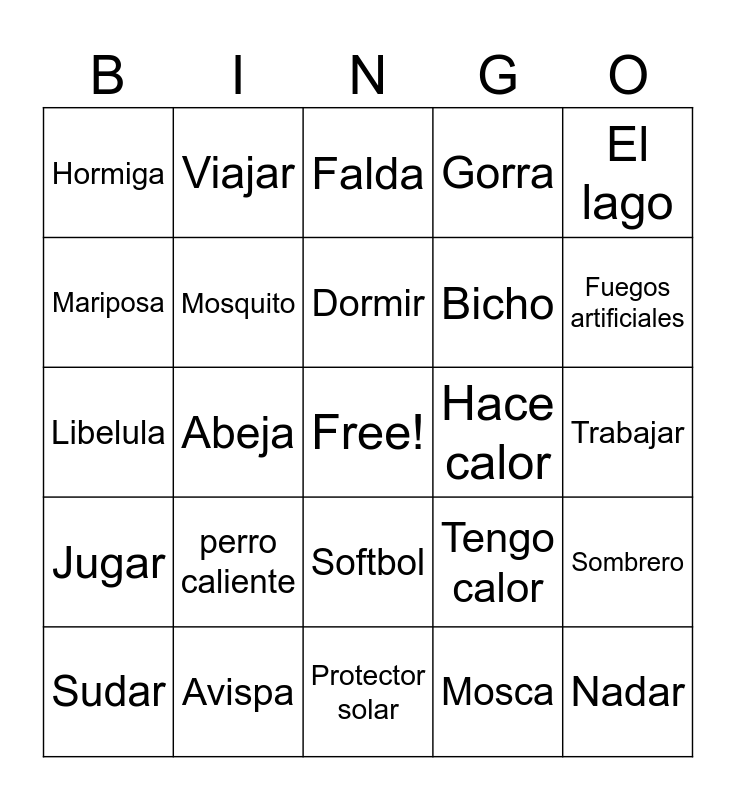 This bingo card has a free space and 24 words: perro caliente, Avispa, Dormir, Sudar, El lago, Hormiga, Mariposa, Viajar, Hace calor, Softbol, Bicho, Libelula, Tengo calor, Sombrero, Mosquito, Mosca, Trabajar, Falda, Fuegos artificiales, Abeja, Nadar, Jugar, Gorra and Protector solar.