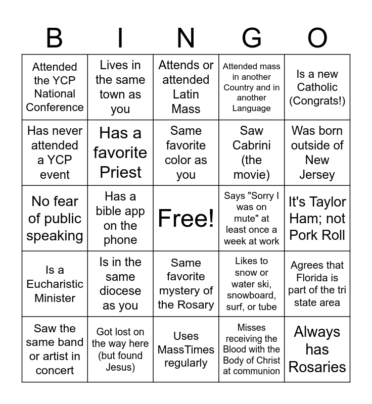 This bingo card has a free space and 24 words: Is in the same diocese as you, Got lost on the way here (but found Jesus), Same favorite color as you, Saw the same band or artist in concert, Is a new Catholic (Congrats!), Attended the YCP National Conference, Has never attended a YCP event, Lives in the same town as you, Says "Sorry I was on mute" at least once a week at work, Same favorite mystery of the Rosary, Saw Cabrini (the movie), No fear of public speaking, Likes to snow or water ski, snowboard, surf, or tube, Agrees that Florida is part of the tri state area, Has a favorite Priest, Misses receiving the Blood with the Body of Christ at communion, It's Taylor Ham; not Pork Roll, Attends or attended Latin Mass, Was born outside of New Jersey, Has a bible app on the phone, Always has Rosaries, Is a Eucharistic Minister, Attended mass in another Country and in another Language and Uses MassTimes regularly.