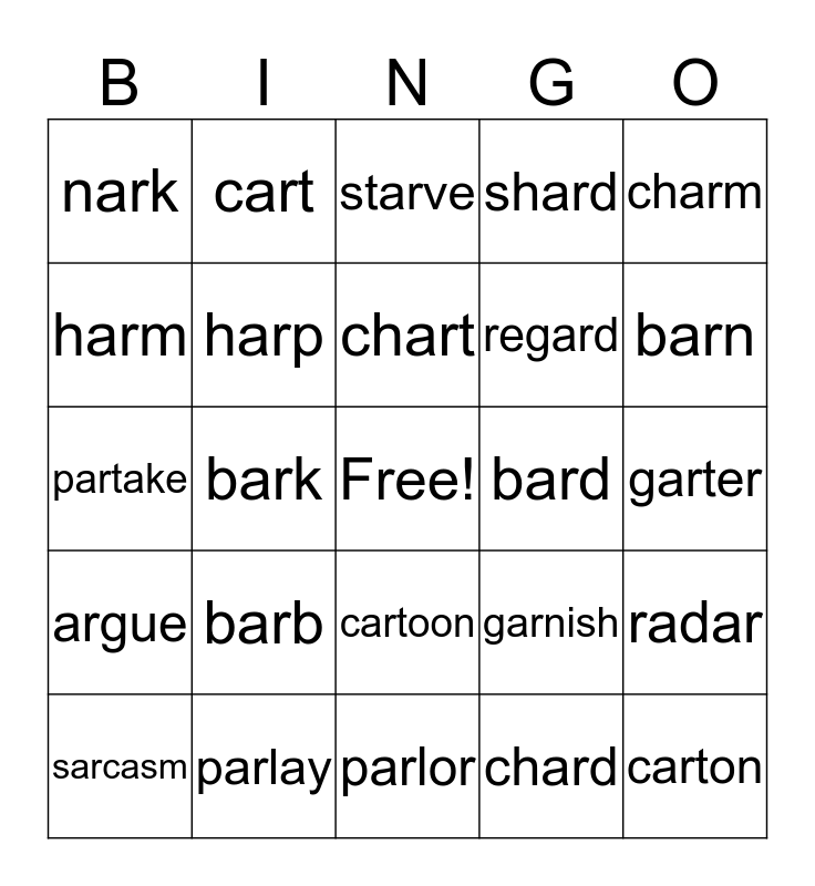 This bingo card has a free space and 24 words: barb, parlay, chart, sarcasm, charm, nark, harm, cart, bard, cartoon, regard, partake, garnish, radar, harp, chard, garter, starve, barn, bark, carton, argue, shard and parlor.
