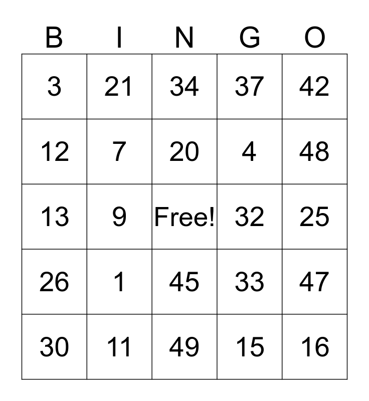 This bingo card has a free space and 24 words: 1, 11, 20, 30, 42, 3, 12, 21, 32, 45, 4, 13, 33, 47, 7, 15, 25, 34, 48, 9, 16, 26, 37 and 49.