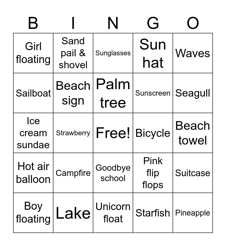 This bingo card has a free space and 75 words: Sun, Beach ball, Sunglasses, Rainbow popsicle, Sand castle, Flamingo, Watermelon popsicle, Surfboards, Ice cream cone, Flip flops, Watermelon, Snow cone, Palm tree, Sailboat, Pool float, Strawberry, Lemon, Pineapple, Umbrella, Waves, Seashells, Ice cream sundae, Beach sign, Sand pail & shovel, Sun hat, Flamingo float, Crab, Swirl ice cream, Beach bag, Beach chair, Baseball hat, Flower, Palm tree glasses, Pink flip flops, Seagull, Sunscreen, Dolphin, Camera, Beach towel, Starfish, Lemonade, Kite, Slushie, Iced tea, Swimming pool, Swim goggles, Boy floating, Girl floating, lifeguard, Whistle, Summer outfit, Goodbye school, Waterslide, Kids swimming, swimboard, Pineapple swimming, Playing in the sprinkler, Fishing pole, BBQ Grill, Picnic table, Campfire, Summer camp sign, S’mores, Amusement park, Hot dog, Bicycle, Tent, Summer rainbow, Sunset, Suitcase, Hot air balloon, Lake, Camping, Unicorn float and Sand toys.