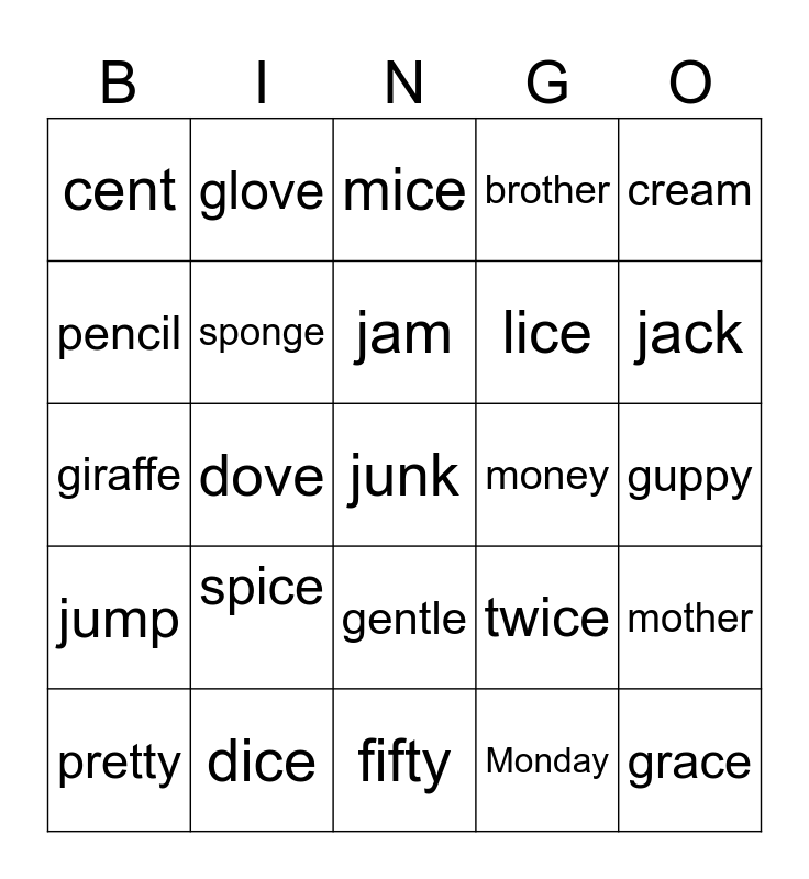 This bingo card has a free space and 34 words: gist, Monday, gent, penny, jump, sponge, cream, pretty, glove, place, jam, mice, wonder, jolly, money, jack, dice, giraffe, spice, twice, gentle, million, cent, guppy, fifty, grace, brother, genius, lice, pencil, gypsy, dove, mother and cell.