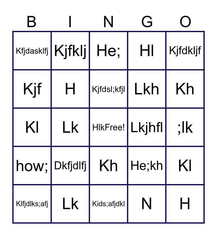 This bingo card has a free space and 25 words: Dkfjdlfj, Kids;afjdkl, Kjfdsl;kfjl, Klfjdlks;afj, Kjfdkljf, Kfjdasklfj, Kjf, Kjfklj, Lkjhfl, Kh, Lkh, Kl, He;kh, Kl, H, Klh, ;lk, He;, Kh, Lk, H, Lk, how;, Hl and N.
