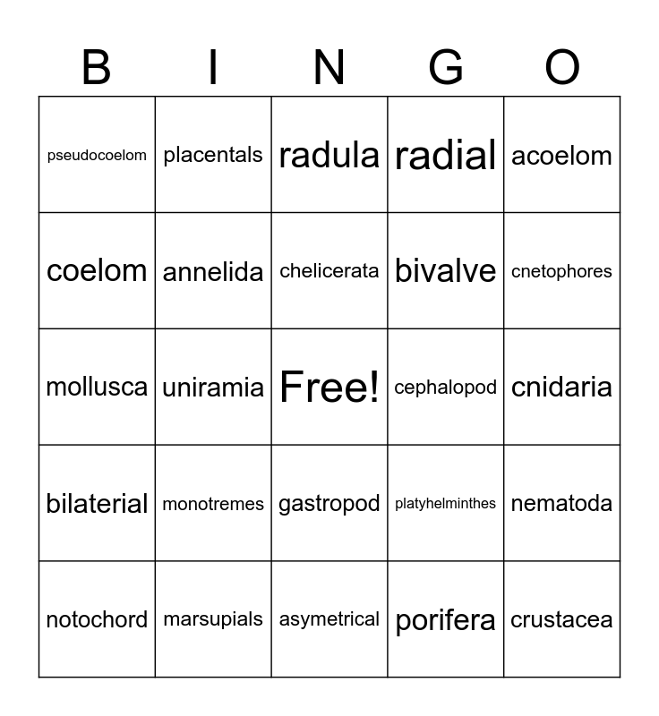 This bingo card has a free space and 24 words: monotremes, marsupials, chelicerata, notochord, acoelom, pseudocoelom, coelom, placentals, cephalopod, gastropod, bivalve, mollusca, platyhelminthes, nematoda, annelida, porifera, cnidaria, radula, cnetophores, uniramia, crustacea, bilaterial, radial and asymetrical.