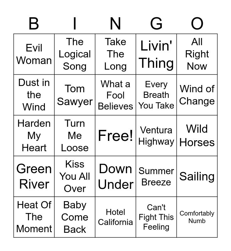 This bingo card has a free space and 39 words: Lunatic Fringe, Driver's Seat, 867-5309, Tom Sawyer, Heat Of The Moment, Down Under, What a Fool Believes, Love Is Alive, All Right Now, Green River, Turn Me Loose, Livin' Thing, Comfortably Numb, Wild Horses, Ventura Highway, Kiss You All Over, Hurricane, Evil Woman, Fly Like An Eagle, Summer Breeze, Dust in the Wind, Hotel California, Every Breath You Take, Wind of Change, With or Without You, If You Leave Me Now, A Horse with No Name, Band On The Run, Give A Little Bit, The Logical Song, Breakfast In America, Goodbye Stranger, Take The Long, Baby Come Back, Can't Fight This Feeling, Take It On The Run, Sailing, Harden My Heart and Ride Like The Wind.