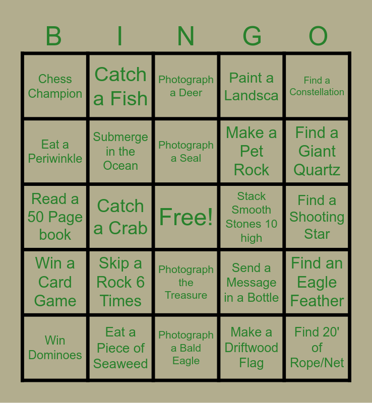 This bingo card has a free space and 26 words: Checkers Champion, Skip a Rock 6 Times, Photograph a Bald Eagle, Make a Driftwood Flag, Find a Giant Quartz, Chess Champion, Catch a Fish, Photograph a Deer, Make a Pet Rock, Find an Eagle Feather, Read a 50 Page book, Catch a Crab, Send a Message in a Bottle, Find 20' of Rope/Net, Win a Card Game, Jump in Deer Island Lake, Photograph a Seal, Stack Smooth Stones 10 high, Find a Constellation, Win Dominoes, Submerge in the Ocean, Photograph the Treasure, Paint a Landsca, Find a Shooting Star, Eat a Periwinkle and Eat a Piece of Seaweed.