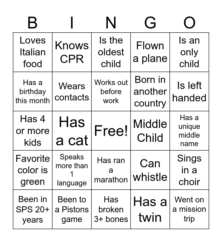 This bingo card has a free space and 24 words: Been in SPS 20+ years, Speaks more than 1 language, Works out before work, Has a twin, Is an only child, Loves Italian food, Knows CPR, Is the oldest child, Middle Child, Has a unique middle name, Has 4 or more kids, Wears contacts, Can whistle, Sings in a choir, Has a birthday this month, Been to a Pistons game, Has broken 3+ bones, Flown a plane, Is left handed, Favorite color is green, Has a cat, Has ran a marathon, Born in another country and Went on a mission trip.