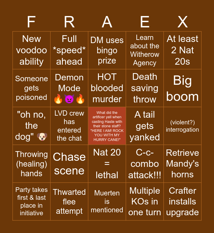This bingo card has a free space and 24 words: Chase scene, Thwarted flee attempt, HOT blooded murder, Party takes first & last place in initiative, At least 2 Nat 20s, New voodoo ability, Someone gets poisoned, Full *speed* ahead, A tail gets yanked, Nat 20 = lethal, Death saving throw, "oh no, the dog" πΆ, C-c-combo attack!!!, Retrieve Mandy's horns, Demon Mode π₯πΏπ₯, Multiple KOs in one turn, (violent?) interrogation, DM uses bingo prize, Big boom, LVD crew has entered the chat, Crafter installs upgrade, Throwing (healing) hands, Learn about the Witherow Agency and Muerten is mentioned.