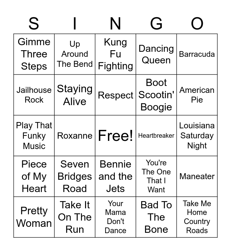 This bingo card has a free space and 35 words: Footloose, Don't Stop Believing, I Love Rock and Roll, Staying Alive, Bennie and the Jets, Dancing Queen, Jailhouse Rock, Let It Be, Respect, Edge of seventeen, Play That Funky Music, Barracuda, Dream On, Centerfold, Gimme Three Steps, Heartbreaker, Bad To The Bone, Roxanne, Piece of My Heart, Take Me Home Country Roads, You're The One That I Want, Pretty Woman, Maneater, Take It On The Run, Kung Fu Fighting, American Pie, In The Summertime, Old Time Rock & Roll, Boot Scootin' Boogie, Louisiana Saturday Night, Hit Me With Your Best Shot, Your Mama Don't Dance, Seven Bridges Road, Up Around The Bend and YMCA.