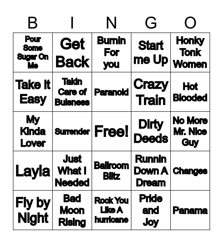 This bingo card has a free space and 29 words: Fly by Night, Nothin But A Good Time, Surrender, Dont Bring Me Down, Pour Some Sugar On Me, Burnin For you, Takin Care of Buisness, Just What I Needed, Dirty Deeds, Bad Moon Rising, No More Mr. Nice Guy, Panama, Rock You Like A hurricane, Pride and Joy, Hot Blooded, Sister Christen, Ballroom Blitz, Layla, Honky Tonk Women, My Kinda Lover, Runnin Down A Dream, White Wedding, Crazy Train, Take it Easy, Start me Up, Get Back, Changes, Paranoid and Fool in the rain.