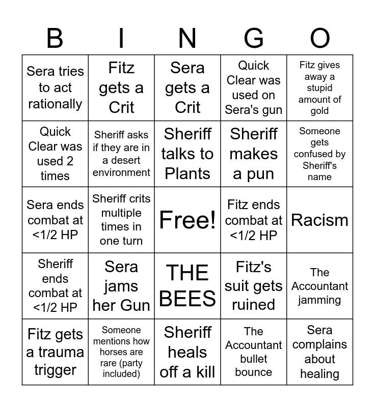 This bingo card has a free space and 24 words: Sera jams her Gun, Someone mentions how horses are rare (party included), Sheriff talks to Plants, Fitz gets a trauma trigger, Fitz gives away a stupid amount of gold, Sera tries to act rationally, Quick Clear was used 2 times, Fitz gets a Crit, Fitz ends combat at <1/2 HP, THE BEES, Sheriff makes a pun, Sera ends combat at <1/2 HP, Fitz's suit gets ruined, The Accountant jamming, Sheriff asks if they are in a desert environment, The Accountant bullet bounce, Racism, Sera gets a Crit, Someone gets confused by Sheriff's name, Sheriff crits multiple times in one turn, Sera complains about healing, Sheriff ends combat at <1/2 HP, Quick Clear was used on Sera's gun and Sheriff heals off a kill.