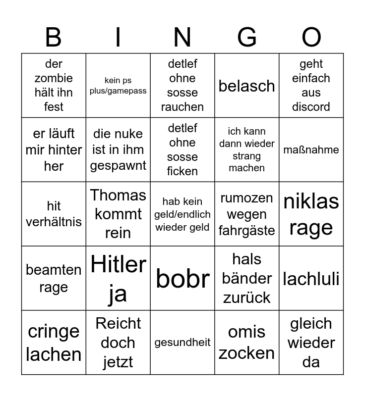 This bingo card has a free space and 24 words: Hitler ja, Reicht doch jetzt, detlef ohne sosse ficken, cringe lachen, geht einfach aus discord, der zombie hält ihn fest, er läuft mir hinter her, kein ps plus/gamepass, rumozen wegen fahrgäste, bobr, ich kann dann wieder strang machen, hit verhältnis, hals bänder zurück, lachluli, die nuke ist in ihm gespawnt, omis zocken, niklas rage, detlef ohne sosse rauchen, maßnahme, Thomas kommt rein, gleich wieder da, beamten rage, belasch and gesundheit.