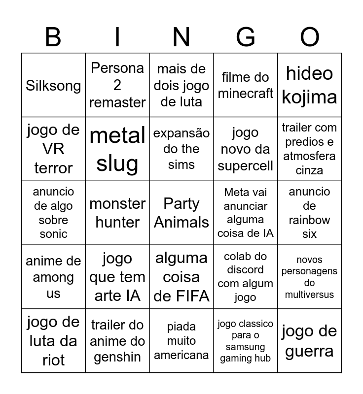 This bingo card has a free space and 24 words: jogo que tem arte IA, trailer do anime do genshin, expansão do the sims, jogo de luta da riot, hideo kojima, Silksong, jogo de VR terror, Persona 2 remaster, Meta vai anunciar alguma coisa de IA, alguma coisa de FIFA, jogo novo da supercell, anuncio de algo sobre sonic, colab do discord com algum jogo, novos personagens do multiversus, metal slug, jogo classico para o samsung gaming hub, anuncio de rainbow six, mais de dois jogo de luta, trailer com predios e atmosfera cinza, monster hunter, jogo de guerra, anime de among us, filme do minecraft and piada muito americana.