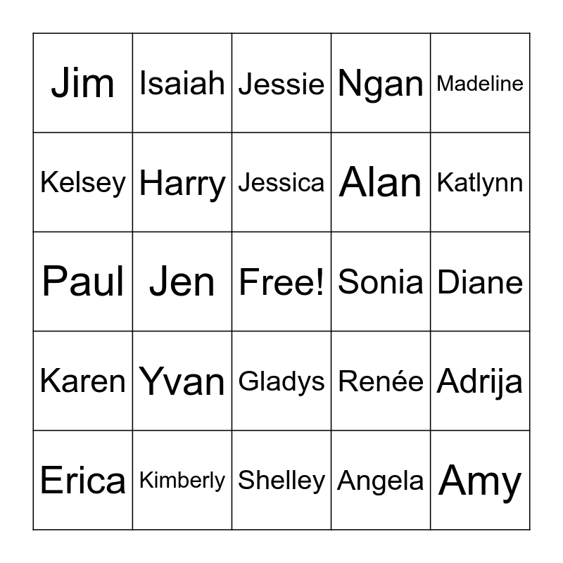 This bingo card has a free space and 28 words: Adrija, Sarina, Alan, Angela, Kelsey, Jessie, Isaiah, Karen, Sonia, Erica, Paul, Ngan, Kimberly, Shelley, Katlynn, Darren, Yvan, Harry, Jessica, Gladys, Jim, Sarah, Amy, Jen, Diane, Renée, Madeline and Nicole.