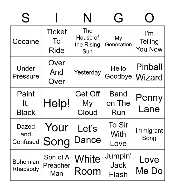 This bingo card has 75 words: I Want to Hold Your Hand, Can't Buy Me Love, The House of the Rising Sun, I Feel Fine, We Will Rock You, She Loves You, Do Wah Diddy Diddy/Manfred Mann, A Hard Day's Night/The Beatles, Season Of The Witch, A World Without Love, Love Me Do, (I Can't Get No) Satisfaction, Yesterday, Under Pressure, Mrs. Brown You've Got A Lovely Daughter, Help!, Downtown, Get Off My Cloud, Wishin’ and Hopin’, I'm Telling You Now, Eight Days A Week, Paint It, Black, Over And Over, Ticket To Ride, My Generation, I Shot The Sheriff, We Can Work It Out, Wild Thing, Change The World, My Love, Whole Lotta Love, Paperback Writer, Sunshine Superman, To Sir With Love, Pinball Wizard, Hello Goodbye, Ruby Tuesday, All You Need Is Love, Penny Lane, Jumpin’ Jack Flash, Hey Jude, You Really Got Me, Get Back, Honky Tonk Women, Baba O’Riley, Bennie And The Jets, Bohemian Rhapsody, Cocaine, Friday I’m In Love, Hungry Like The Wolf, Brown Eyed Girl, Let’s Dance, Lola, London Calling, Sympathy For The Devil, Who Are You, Rock The Casbah, Ramble On, Start Me Up, Wonderful Tonight, Your Song, Twist and Shout, Time Of The Season, Mellow Yellow, Imagine, Band on The Run, Sunshine of Your Love, Come Together, My Sweet Lord, Immigrant Song, Dazed and Confused, Son of A Preacher Man, Happy Together, White Room and Layla.