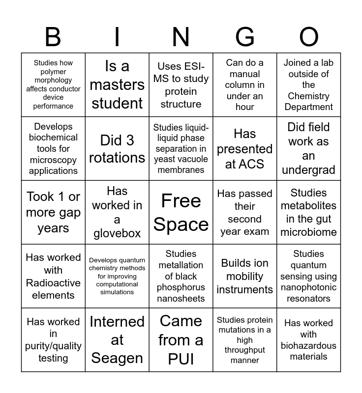 This bingo card has a free space and 24 words: Develops quantum chemistry methods for improving computational simulations, Interned at Seagen, Studies liquid-liquid phase separation in yeast vacuole membranes, Has worked in purity/quality testing, Joined a lab outside of the Chemistry Department, Studies how polymer morphology affects conductor device performance, Develops biochemical tools for microscopy applications, Is a masters student, Has passed their second year exam, Studies metallation of black phosphorus nanosheets, Has presented at ACS, Took 1 or more gap years, Builds ion mobility instruments, Studies quantum sensing using nanophotonic resonators, Did 3 rotations, Studies protein mutations in a high throughput manner, Studies metabolites in the gut microbiome, Uses ESI-MS to study protein structure, Did field work as an undergrad, Has worked in a glovebox, Has worked with biohazardous materials, Has worked with Radioactive elements, Can do a manual column in under an hour and Came from a PUI.