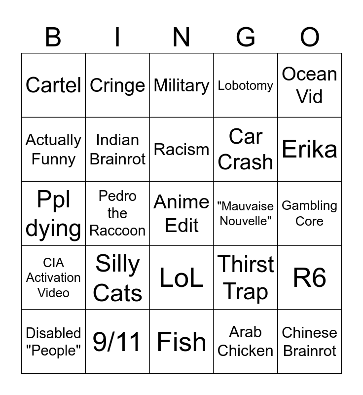 This bingo card has a free space and 24 words: Silly Cats, 9/11, Racism, Disabled "People", Ocean Vid, Cartel, Actually Funny, Cringe, "Mauvaise Nouvelle", LoL, Car Crash, Ppl dying, Thirst Trap, R6, Indian Brainrot, Arab Chicken, Gambling Core, Military, Erika, Pedro the Raccoon, Chinese Brainrot, CIA Activation Video, Lobotomy and Fish.