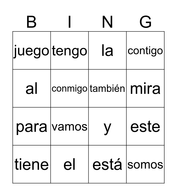 This bingo card has 16 words: el, este, la, juego, para, tengo, y, está, al, conmigo, tiene, contigo, vamos, mira, también and somos.