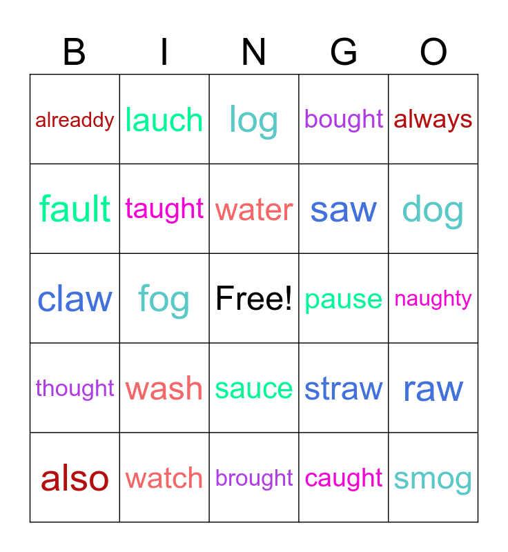 This bingo card has a free space and 24 words: wash, watch, water, also, always, alreaddy, fault, lauch, pause, sauce, saw, claw, straw, raw, taught, caught, naughty, log, dog, fog, smog, thought, bought and brought.