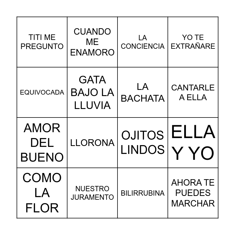 This bingo card has 40 words: TUSA, GATA BAJO LA LLUVIA, BESAME, AHORA TE PUEDES MARCHAR, COMO LA FLOR, BAJO EL AGUA, LA BACHATA, MIENTEME, TITI ME PREGUNTO, NUESTRO JURAMENTO, CAMINOS DE LA VIDA, CANTARLE A ELLA, EQUIVOCADA, LLORONA, ME HACE DAÑO VERTE, AMOR ETERNO, MI BUEN AMOR, CUANDO ME ENAMORO, A PRUEBA DE TODO, YO TE EXTRAÑARE, AMOR DEL BUENO, LA BODA (AVENTURA), OJITOS LINDOS, ELLA Y YO, NO SE VA, UN X100TO, MAÑANA SERA BONITO, BESOS EN GUERRA, LUNA, TIROTEO, BORRO CASSETTE, POR AMAR A CIEGAS, SOBRIO, VIDA DE RICO, BILIRRUBINA, SHAKIRA || BZRP, SUAVEMENTE, LAS AVISPAS, LA CONCIENCIA and LLORARÁS.