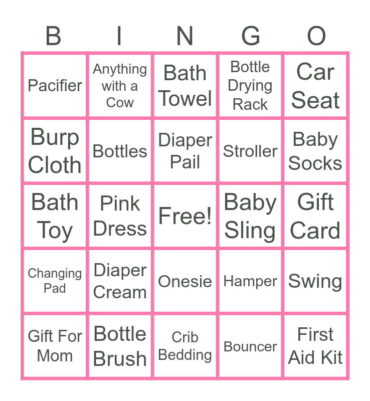 This bingo card has a free space and 41 words: Nasal Aspirator, Bath Toy, Feeding Pillow, Bottles, Bottle Brush, Onesie, Diaper Pail, Baby Monitor, Car Seat, Changing Pad, Pink Dress, Bottle Drying Rack, First Aid Kit, Gift Card, Baby Sling, Diaper Cream, Baby Shampoo, Pacifier, Bath Tub, Bath Towel, Swing, Diaper Bag, Crib Bedding, Stroller, Stuffed Animal, Swaddle Blanket, Bouncer, Baby Hat, Baby Socks, Rattle, Teething Toy, Anything with a Cow, Gift For Mom, Activity Mat, Hamper, Burp Cloth, Mittens, Baby Lotion, Picture Frame, Teddy Bear and Play Pen.