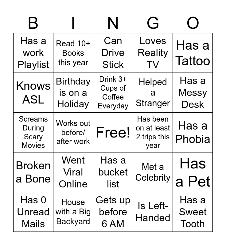 This bingo card has a free space and 24 words: Went Viral Online, House with a Big Backyard, Drink 3+ Cups of Coffee Everyday, Has 0 Unread Mails, Has a Tattoo, Has a work Playlist, Knows ASL, Read 10+ Books this year, Has been on at least 2 trips this year, Has a bucket list, Helped a Stranger, Screams During Scary Movies, Met a Celebrity, Has a Pet, Birthday is on a Holiday, Is Left-Handed, Has a Phobia, Can Drive Stick, Has a Messy Desk, Works out before/ after work, Has a Sweet Tooth, Broken a Bone, Loves Reality TV and Gets up before 6 AM.